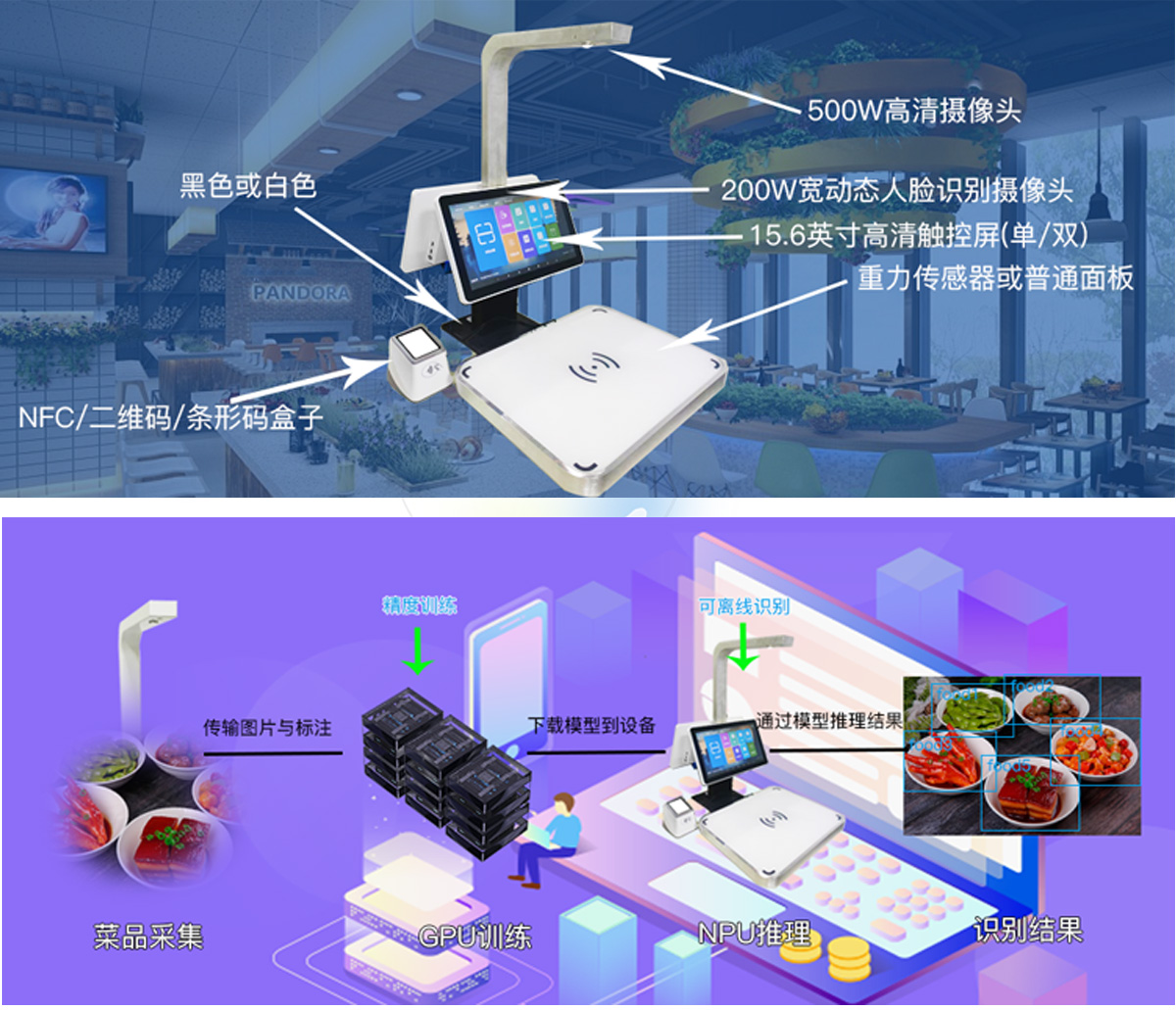 AI菜品(扫描)识别设备,采用AI菜品识别算法更快更好的就餐体验,同时可以根据客户进行个性化的软件与结构定制服务。